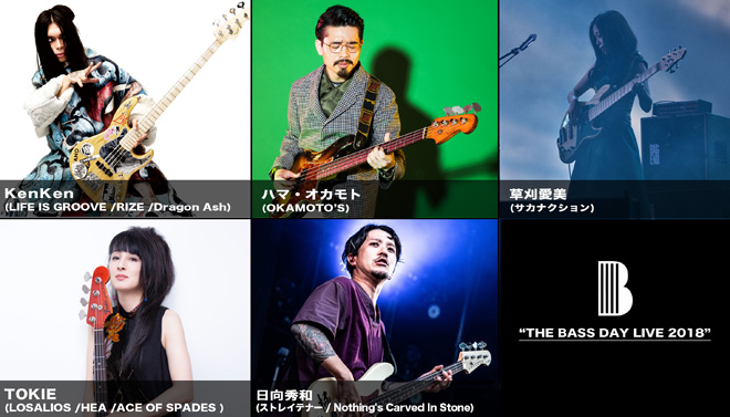 東京・マイナビBLITZ赤坂で11月11日(日)に開催される<THE BASS DAY LIVE 2018>には、ハマ・オカモト(OKAMOTO’S)、KenKen(LIFE IS GROOVE / RIZE / Dragon Ash)、TOKIE(LOSALIOS / HEA / ACE OF SPADES)、日向秀和(ストレイテナー / Nothing’s Carved In Stone)、草刈愛美(サカナクション)の5人のベーシストの出演が決定している。当日は、バンドアクト、ジャムセッション、スペシャルユニットなど様々なスタイルでのライブパフォーマンスに加えて、トークコーナーも予定されているとのことだ。