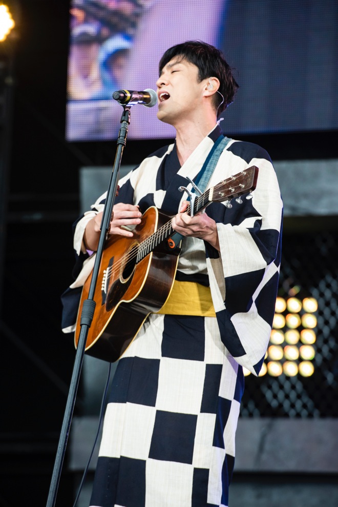 7度目の夏を迎える今回は、あいにく冷たい雨が降るなかでスタート。オープニングセレモニーアクトとして、例年どおり“友情出演”の森山直太朗が浴衣姿で登場すると、「18年前に“氣志團万博のために”作った曲を聴いてください」というジョークを口にしながら、「さくら(独唱)」を弾き語りで披露した。うっすらと桜色の光がステージを照らすなか、唯一無二のファルセットボイスが海辺の会場に伸びやかに響き渡っていく。