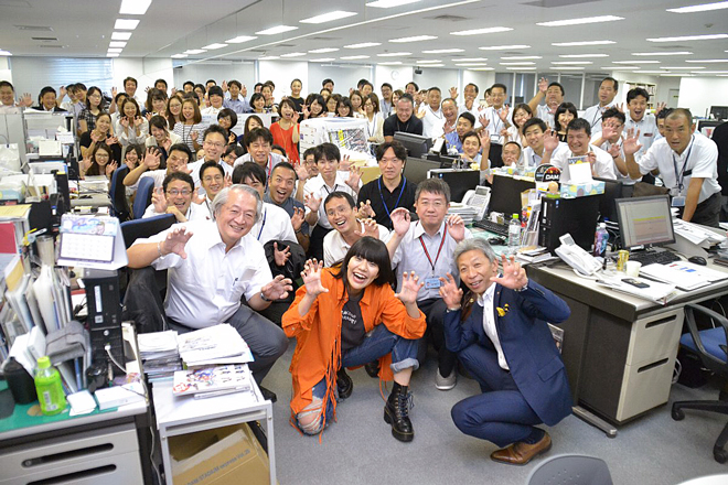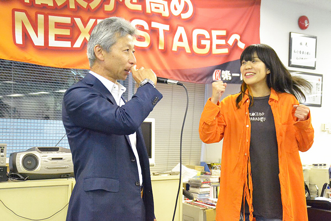 最後は社員一同と、「はい、シーサー!」と、沖縄出身らしいコールでポーズをとって記念撮影。盛大な拍手に見送られて、「どうもありがとうございました!よろしくお願いします!」と、再び大きく両手を広げて退室して表敬訪問は終了となった。短い時間ながら、その明るく元気なキャラクターを強く印象付けた。