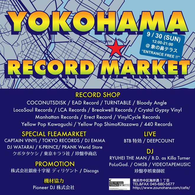 今回、横浜での開催となる<YOKOHAMA RECORD MARKET>には、レコードショップ15店舗に加え、スペシャルアーティストフリーマッケットとして、クボタタケシ、DJ WATARAI、DJ EMMA、CAPTAIN VINYLなどが出店参加、さらに会場ではRYUHEI THE MANやIMSBらのDJ、ライブまでが入場無料で楽しめ、レコードフリークにはたまらないラインナップとなっている。