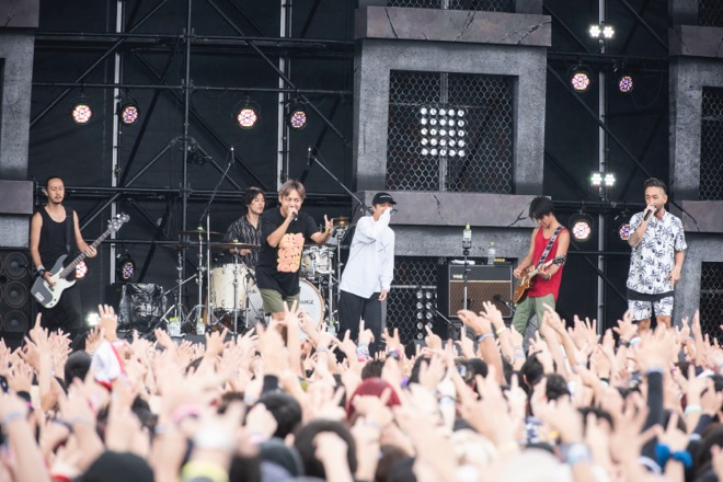 「今日はみんなでひとつになろう、つながりを強くしようという願いを込めて」という紹介から、デジタルなイントロが心を踊らせた「以心電信」では、フロント3人のマイクリレーとサビで訪れる圧倒的な昂揚感で集まったお客さんが一斉にジャンプ。これまでに一度のメンバーチェンジもなく、沖縄という自身のルーツを大切にしながら育んできたメンバーの絆によって、会場をORANGE RANGEのペースに巻き込んでいった。