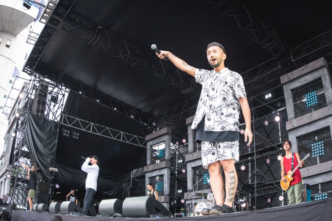 RYOの問いかけに手を上げたお客さんはMOSSAI STAGEのフィールドから溢れ出し、ステージの遥か後方の海際エリアまで埋め尽くされている。HIROKIが「沖縄の風を感じてください」と紹介した穏やかなポップソング「Ryukyu Wind」は、8月にリリースされたばかりのアルバム『ELEVEN PIECE』の収録曲。結成から17年を経て、かつてないほどリラックスしたモードで制作に臨んだORANGE RANGEの“いま”が反映された楽曲が潮風にのって心地好く響きわたった。