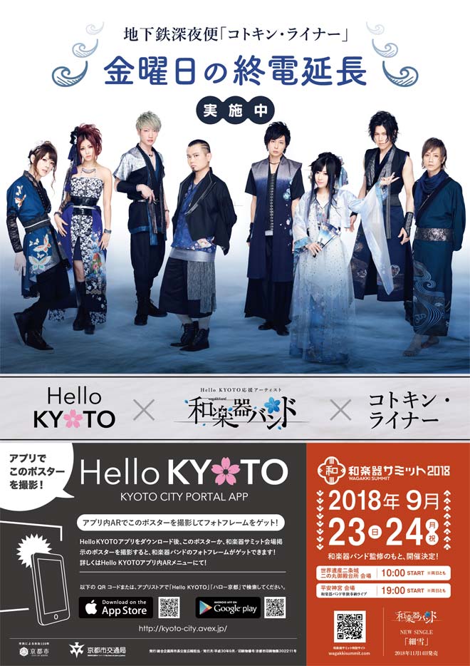 このコラボ企画では、京都市営地下鉄の金曜日限定深夜便である「コトキンライナー」と和楽器バンドとのコラボレーションポスターが京都の街に登場する。今週より9月25日まで京都市営地下鉄各駅に掲示されるポスター画像や<和楽器サミット2018>会場掲示の看板画像をアプリ内のAR機能で取り込むと、和楽器バンドの期間限定デジタルフォトフレームを入手することができほか、和楽器バンドメンバーのサイン入りグッズが当たるアプリ内限定のキャンペーン等も展開される。