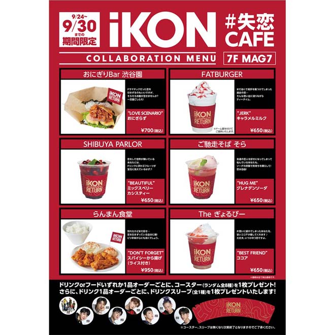 iKONが9月26日のニューアルバム『RETURN』リリースを記念し、MAGNET by SHIBUYA109 7Fフードエリア「MAG7」にて『iKON 失恋カフェ』をオープンする。