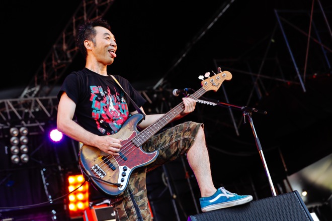 祭りの到来を告げるSEを背に、坂詰克彦(Dr)、上原子友康(G)、清水泰次(B)が順に登場。大きな拍手が巻き起こる中、増子直純(Vo)が颯爽と姿を表し、ビシッとクシで髪の毛を整えて、「裸武士」から始まったライブはもう迫力満点。この曲に限らず、全編を通してそうだったが、増子の指先からつま先まで神経が行き届き、力がみなぎっていることが遠くからでもわかるパフォーマンスは強烈だ。観るものすべての心に火を点けていき、気持ちいい青空の下、会場中から上がる“スッポンポン”の大歓声も痛快。最高のスタートダッシュを決める。