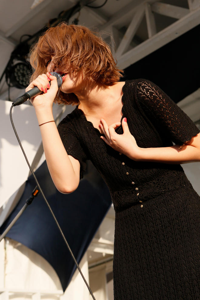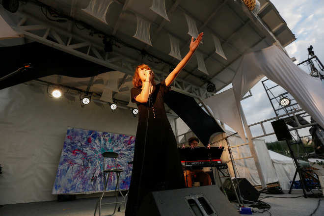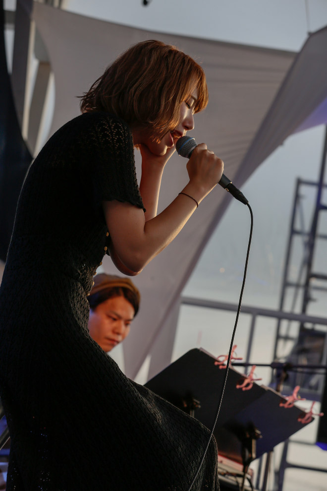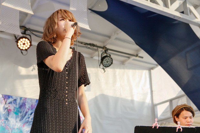 ぐっと傾き始めた太陽の光がやさしい丘の上のRESILIENCE STAGEに穏やかなピアノの音色が響いた。弾いているのは、チャンポンタウン、溺れたエビ!のメンバーで、この時間のRESILIENCE STAGEの主役、チアキのバックを務めるチアキバンドのメンバーでもある赤松憲だ。ステージの周りにあるベンチやデッキチェアーで休息を取っている人々を癒すようにピアノの音色が流れる中、黒いワンピース姿のチアキがその天真爛漫なキャラを物語るようにスキップでステージに登場。一礼すると、赤松のピアノに合わせ、「blueberry night」を歌い始めた。