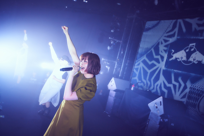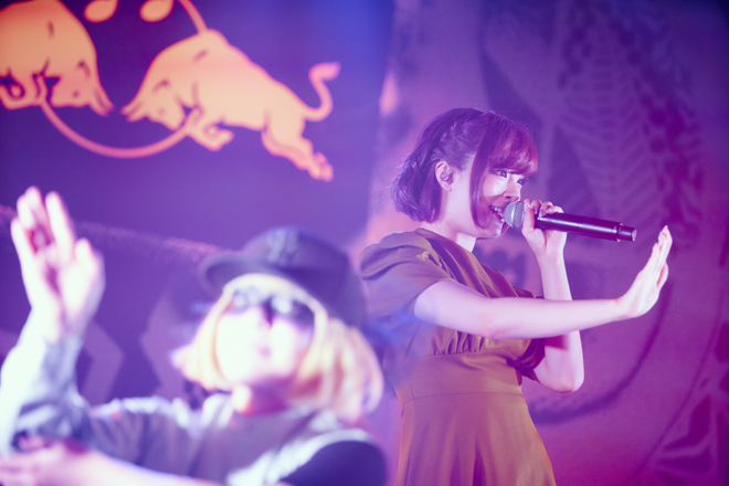 レッドブルカラーの衣装トークでさらに会場を盛り上げつつ、つづく「梯子酒」では、リリック中に出てくるお酒の名前をすべてレッドブルに変えるという荒業。ヤラせではなく、あくまで自発的であるのコトを強調していたが、営業の基本マナーを熟知しているトコロは、やはりキング!オブ!!ステージ!!!