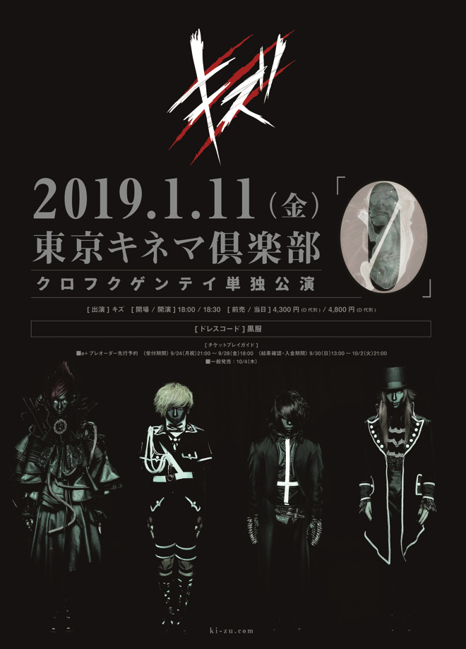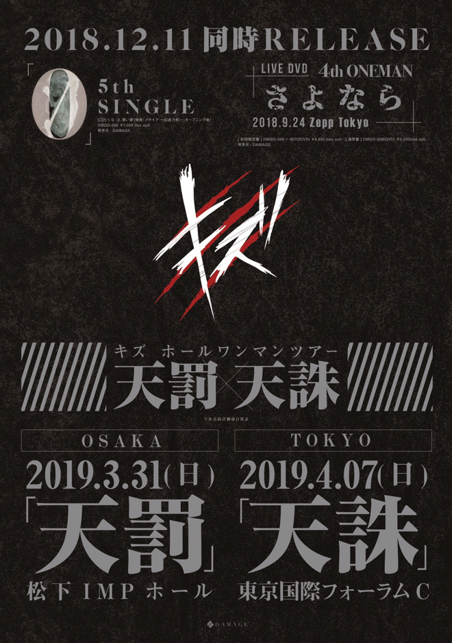 そしてライブを終えたキズは、全員顔面黒塗りの最新ヴィジュアルほか、最新情報を一挙に解禁。そして2018年12月11日に5thシングル「0」をリリースすること。このシングルにカップリング曲として収録されている「悪い夢」は映画『メサイア ー幻夜乃刻ー』のオープニング曲としてタイアップも決定している。