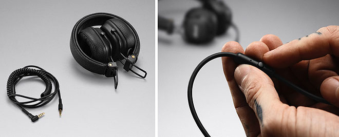 ▲本体は折りたたみ可能。ケーブルにはマイクとクリック式のリモコンを搭載、(写真は有線モデルMAJOR III Black)。L型プラグ仕様で耐久性に優れ、持ち運びにも便利。