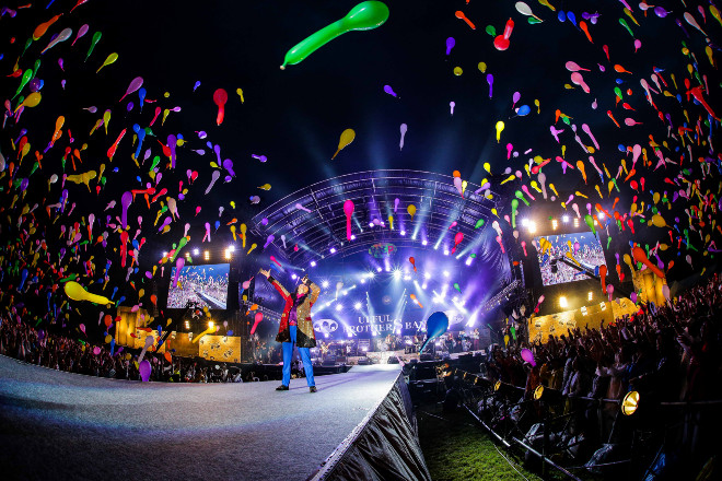 当日はあいにくの空模様にもかかわらず、約15,000人のファンが来場。悪天候も吹き飛ばすようなパワフルなパフォーマンスで、新旧ヒット曲満載の約2時間半に及ぶステージを駆け抜けた。以下、そのオフィシャルレポートをお届けしたい。