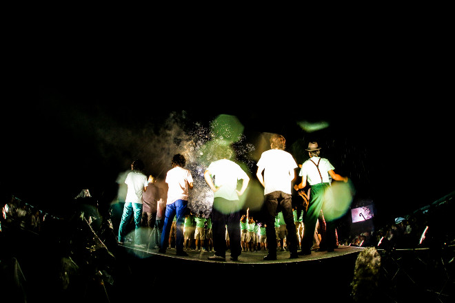 2曲目の「せやなせやせや人生は」の演奏後、トータス松本はギターを持ち「大阪! 1年ぶり! ウルフルズです! ありがとう! ヤッサが始まったときは3人やった。その後4人になって、また3人になった!」と、今回からまた新たに3人体制のバンドとなったウルフルズをアピール。「みんなのエネルギーがぶわーっと雲になって雨が止んだ!」と奇跡的な天候の回復を会場一体となって祝福した。そんな中、「大阪府知事の松井一郎さんが駆けつけてくれました!」とトータス松本が声を上げると、松井一郎大阪府知事が登場。「世界の国からこんにちは」を歌いながら姿を見せた松井府知事は、「<大阪文化芸術フェス>の幕開けということで、みんな楽しんでください!」と挨拶した。