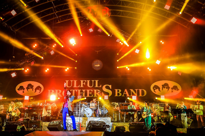 ステージ上には“ULFUL BROTHERS BAND”と大きく掲げられた看板、そして映画『ブルース・ブラザーズ』を彷彿とさせるレンガ調の装飾が施されており、ミュージカルの舞台さながらの装飾にまず圧倒される。会場内に流れるBGMも心地よいロックサウンドで、開演時間を今か今かと待ちわびるファンのテンションも徐々に高ぶっているのがわかる。昼過ぎまで土砂降りだった雨が開演時間30分前には止んで、空が明るくなるという奇跡的な状況になったのも、30年間にわたって日本の音楽シーンを華やかに彩り続けてきたウルフルズが持つ強運のおかげなのだろうか。
