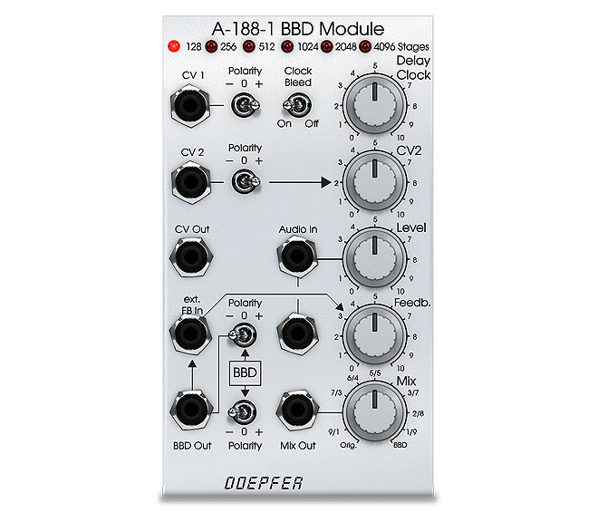 Doepfer Musikelektronik社公認の「A-188-1 BBD」もSoftube「Modular」用アドオン。歪んだディレイ、フランジャー・エフェクト、コーラスなどをジェネレートしてCVでコントロールすることができる。BBDはコンデンサーを使用してシグナルをサンプリングしディレイさせるが、ディレイ・タイムが長くなるにつれてサウンドが変化する。これは、クリエイティブなオプションをもたらし、ドラム、ギター、ボーカルからシンセサイザーまで、あらゆるサウンドに特別なディメンションを提供できる。さらにBBD素子を6ステージ搭載し、多彩なディレイ・ラインの長さを選択可能だ。
