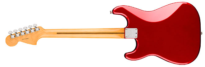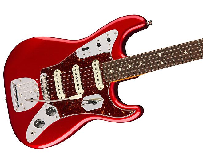 クローム製のパーツと優美なコンターが高級感を演出。クローム製のコントロールプレートと、べっ甲柄のJaguarピックガードは、Stratocasterの代名詞である流線型のアルダーボディをよりスタイリッシュに仕上げている。ボディカラーはCandy Apple Red。