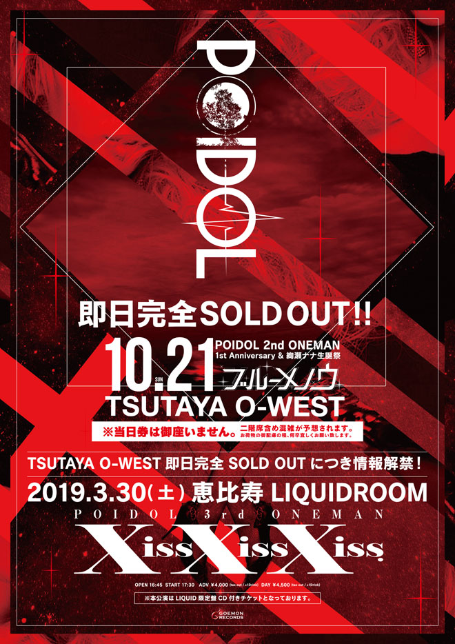10月21日(日)TSUTAYA O-WESTにて行われる<2nd ONEMAN「ブルーメノウ」>のチケットを二階席含め即日完全ソールドアウトさせたPOIDOL。これはバンド始動わずか1年での快挙となるが、次なるワンマンとして2019年3月30日(土)、恵比寿LIQUIDROOMにて<POIDOL 3rd ONEMAN「Xiss Xiss Xiss.」>を開催する。タイトルの“Xiss Xiss Xiss.”に込められた意味とは…?ファンは今後の情報も楽しみに待とう。