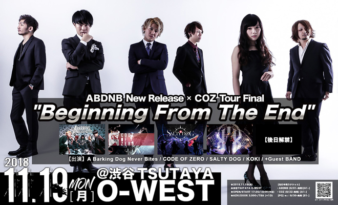 ツインボーカルを擁し“DANCE CORE”を掲げるロックバンド“A Barking Dog Never Bites”と、ソロプロジェクト“CODE OF ZERO”による共同主催イベント<Beginning From The End>が11月19日(月)に渋谷TSUTAYA O-WESTにて開催される。そのスペシャルゲストとして、SALTY DOGとKOKI (ex:INKT/田中聖)の出演が発表された。