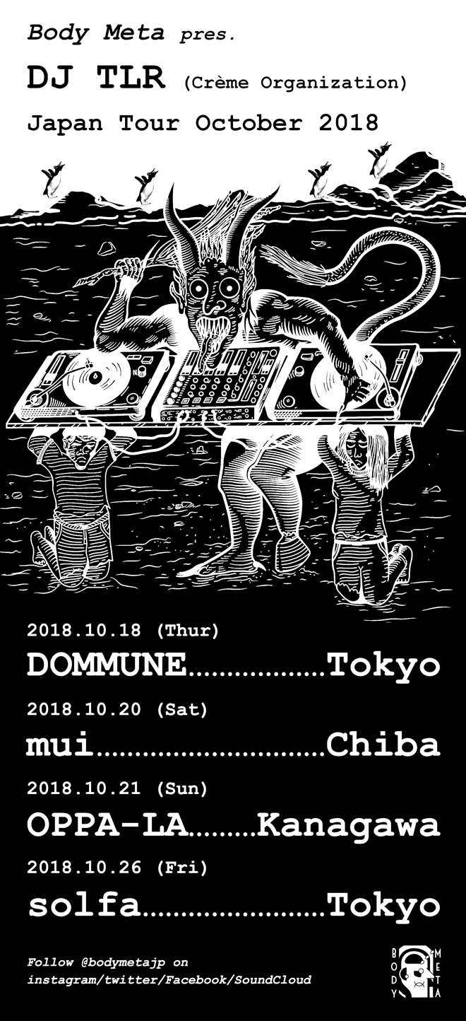 <Body Meta presents DJ TLR Japan Tour October 2018>と題された今回のツアーでは、10月18日 (木) のDOMMUNEを皮切りに、前回も好評を博した千葉mui千葉、江ノ島OPPA-LAでのサンセット・パーティに加え、東京・中目黒solfaではSkatebård(Digitalo Enterprises/Sex Tags Mania)とのスペシャルダブルヘッダーの4公演が行われることが決定している。