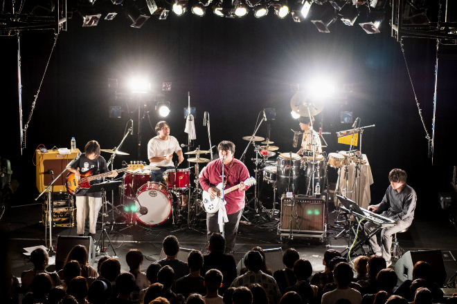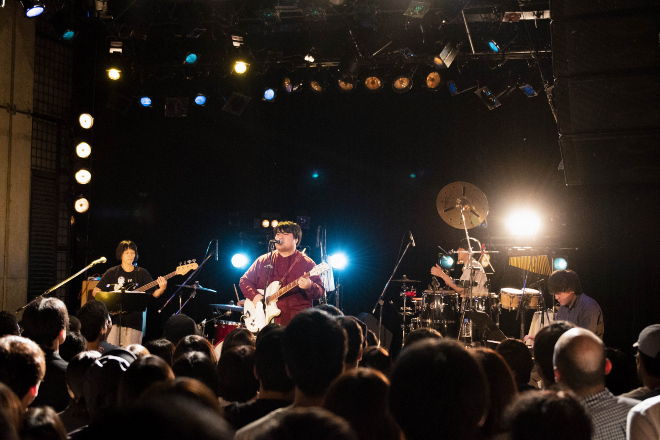 「さよなら!さよなら!」、「視界良好」、「手の鳴る方へ急げ」と、アルバム『20/20』からの人気曲でスカートのライヴは幕を開けた。Contorversial Sparkや、のんシガレッツにも参加している岩崎なおみを新たなサポート・ベーシストに迎えてから数回めのライヴ。ボトムの安定感が増すと、5人のグルーヴもさらに多彩になり、澤部の曲の持つまるみや繊細な持ち味も生きてくる。10月31日にリリースされるメジャー・ファースト・シングル「遠い春」(映画『高崎グラフィティ』主題歌)や、そのカップリング曲「いるのにいない」で澤部はアコースティック・ギターを弾いた。もちろんこれまでも澤部のソロ・ライヴなどでアコギは何度も聴いてきたけど、バンド・サウンドの中で、かきむしるようにではなく柔らかいものをなでるような響きで聴くのは、ちょっと新鮮な体験だった。