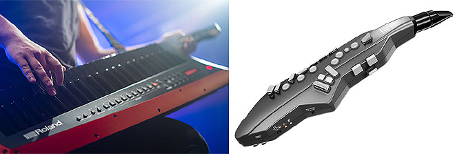▲ショルダー型キーボードの新製品「AX-Edge」(左)、コンパクトになったデジタル管楽器の新モデル「Aerophone GO」(右)