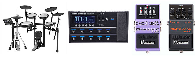 ▲Vドラム「TD-17KVX-S」、ギター・エフェクツ・プロセッサー「GT-1000」、WAZA CRAFTシリーズ「DC-2W」「MT-2W」。
