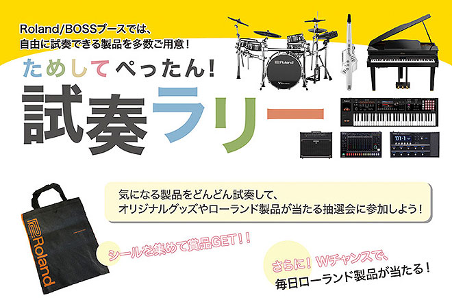 Roland/BOSSの気になる楽器をどんどん試奏して、スタッフからシールをもらって台紙にぺったん。シールを4つ集めた方、毎日先着500名様に「Rolandオリジナル不織布バッグ」をプレゼント。さらにWチャンスで、毎日Roland/BOSS製品が当たる抽選会に参加できる。