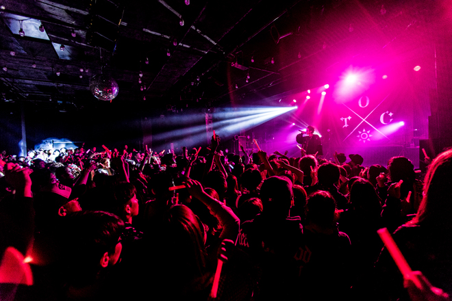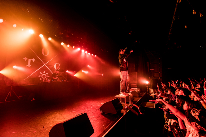 まずはソロであるTOC(ティーオーシー)サイドからライブはスタート。ステージに明かりが灯り、Gucciのスタジャンに身を包んでステージに登場したTOCは、「Today is my birthday!」とシャウトし、2013年の誕生日にリリースされたソロデビュー曲「BirthDay」を披露。ソールドアウトした会場は、ファンが手にするTOCの誕生日を祝う赤いサイリウムに埋め尽くされる。その光景にはTOCも驚いたようで「こんなLIQUIDROOM初めて見たよ。ありがとう」と会場にメッセージ。その言葉と呼応するように、会場からは「おめでとう」というコールが様々な場所から起き、TOCとリスナーとの深いつながりを感じさせられた。