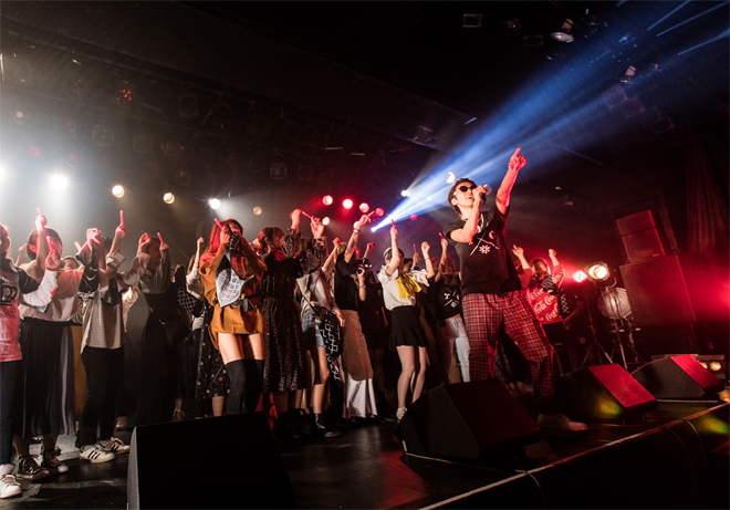そのままハードなビートに彩られた「リスキーダイス」、じっくりと聴かせる「過呼吸」とカラーの違う2曲を披露し、ソロとしての幅の広さを見せたTOCは、「ソロを5年間やって、当初から変わらないことがある。それは女性をステージに上げること。今回は齢の数だけ女性をステージに上げたい」と宣言し、ステージに上げた37人の女性ファンに囲まれながら「HATE」を披露。異様な高揚感の中、ファンにもみくちゃにされながらラップするTOCと、「何が起こってるんだ……」というあっけにとられた表情を浮かべるバックDJ・DJ AGETETSUとのコントラストが、非常に印象的だった。