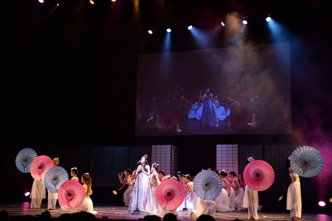 2曲目は「渡月橋 〜君 想ふ〜」。真っ赤な衣装に身を包んだ30名以上のダンサー達は、ゆらりとした楽曲にメリハリのある舞を合わせ、この楽曲に艶やかな魅力を加えていった。3曲目はこの日初披露となった「花言葉」。同じく京都をイメージした楽曲が真っ白の衣装に身を包んだダンサーによる美しい傘の演出を交えて披露される。ドラマチックな楽曲にぴったりなうっとりするようなステージに、会場が魅了された。