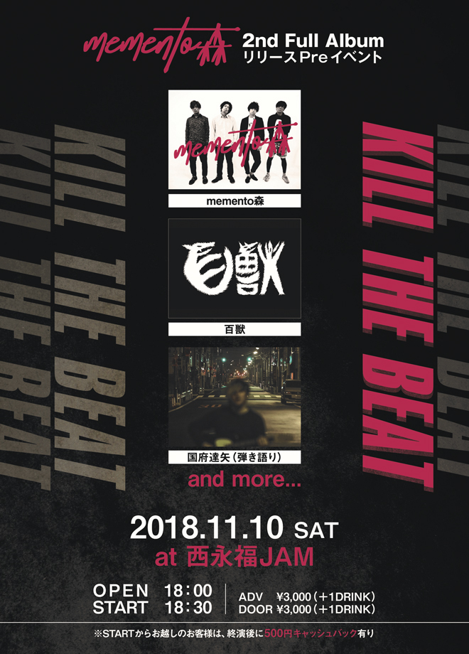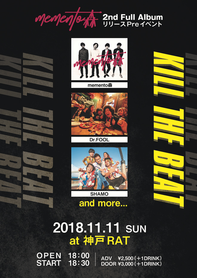また、アルバムのリリースに先駆けて<memento森 2nd Full Album リリースpreイベント『KILL THE BEAT』>を開催することも発表された。イベントは11月10日に東京、11月11日に神戸で行なわれる。
