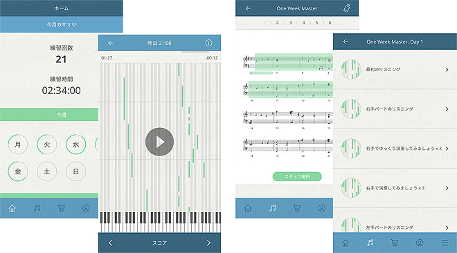 ▲「Piano Every Day」は、ホーム画面(左)に自分が練習した回数や練習時間など演奏記録を表示。1週間で1曲演奏に挑戦できる「1 Week Master」(右)では、曲を短いフレーズに区切って、右手ずつ左手ずつ弾くなど毎日の練習プログラムが示され、楽しみながら曲を完成させることができる。