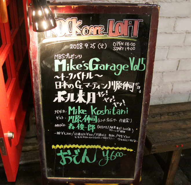 9月25日ROCK CAFE LOFTでの第5回目は「日本のG.マーティン 川原伸司が語るポール来日 ヤァ!ヤァ!ヤァ!」。雨天にも関わらず多くの音楽フリークの皆さんがご来場。