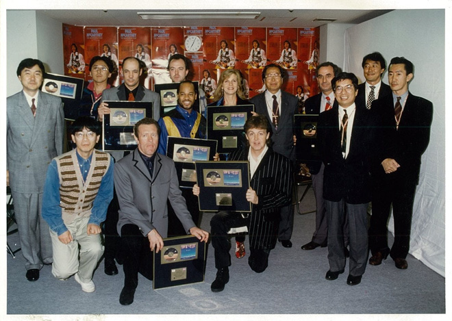 ▲1993年11月のポール・マッカートニー来日時に開演前の東京ドームバック・ステージで行われた売り上げ枚数10万を超えていた当時の最新アルバム『Off the Ground』のゴールド・ディスク授与式の記念ショット。前列左から西村恵、ヘイミッシュ・スチュアート、ポール・マッカートニー。後列左から菊地洋一郎、 森俊一郎、ポール“ウィックス”ウィッケンズ、ロビー・マッキントッシュ、ブレア・カニンガム、リンダ・マッカートニー、乙骨剛、ピーター・バックリー/EMI Resident Director、斉藤正明、角間裕之、石坂敬一(日本人は株式会社東芝EMI所属=当時)。提供:森俊一郎さん