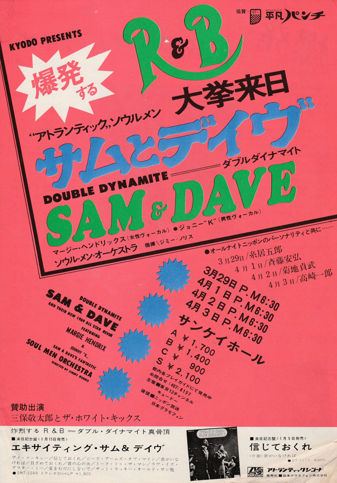 ▲1969年来日公演告知チラシ 下のLP広告ではサム&デイヴなのにメインの公演インフォの方ではアーティスト名が“サムとデイブ”になっている from Mike’s Collection