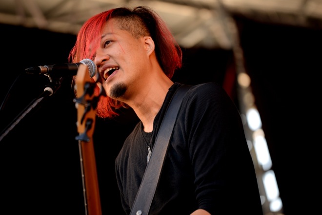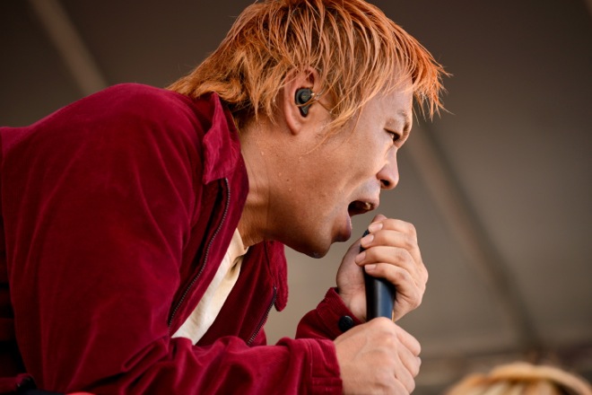 N∀OKIが叫ぶと、10日前に行なった武道館公演の勢いそのままに、「D.A.N.C.E.」をぶちかます。いきなりクライマックを迎えたかのようにサークルモッシュが発生し、ダイバーたちが最前列の観客の頭上で大渋滞を巻き起こす。さらにN∀OKIは「歌え!叫べ!飛べ、飛べ、飛べ!ぶっ飛べ!」と観客を煽り、KAZUOMIのギターリフが陽射しを切り刻み、HIROSHIの重量感のあるキックと、侑威地の太いベースで、「PLAYBACK」へ突入。そんなヘヴィなサウンドと対照的に、NOBUYAの伸びやかなハイトーンが、雲ひとつつない青空に抜けていった。