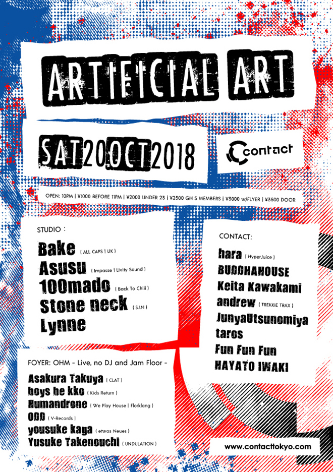 初開催となる今回、StudioXフロアを揺るがすのは、多彩な要素を合わせ持つサウンドで知られるBakeだ。スコットランド出身の彼は、自身のレーベル“All Caps”から、Kowton、Bluntman Deejay、Fløristといったアーティストの作品をリリースし、その運営手腕が話題となった。一方、持ち前の鋭い感性により、DJとしての評価も確立。著名ラジオ局「Rinse FM」でのレギュラー番組のほか、イギリス国内外のイベントやBoiler Roomへの出演を通じて広範囲に存在感を示している。<ARTIFICIAL ART>への出演でも、最先端のUKアンダーグラウンドミュージックから意識までをも揺るがす強烈な選曲を披露するのは確実だろう。