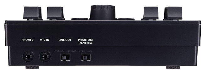 ▲フロントパネルにはステレオミニのヘッドホン出力とマイク入力(プラグイン・パワー)、ライン出力の切り替えスイッチ(ステレオ/モノ)、ファンタム電源スイッチ(リア・マイク用)を配置。