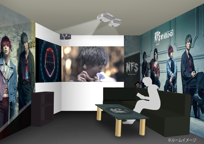 壁やテーブルなどルーム全体をMY FIRST STORYのデザインでラッピング。さらに限定のコメント映像やライブ映像などスペシャルなコンテンツが大画面で楽しめる。カラオケを楽しんだり写真を撮ったり、楽しみ方はあなた次第!