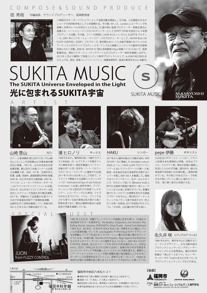 通常、こうした写真展では、被写体に関係する既成の楽曲が館内BGMとして使用されることが多いが、「それでは面白くない」という、同写真展実行委員会の伊佐高吉(88Studio)のアイデアで、異例となる写真展オリジナルの楽曲を制作。その作曲を、福岡で活動する音楽プロデューサー堤秀樹(A-HEAD RECORDS)が手がけ、写真展の会場を彩った。今回の<SUKITA MUSIC 再現&進化形ライブ>は、そのオリジナル楽曲をフィーチャーしたライブとなる。