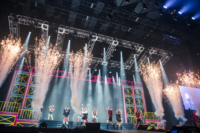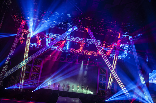 ステージには、横一列に並んだ9人が堂々と姿を現した。全員が黒のロングブーツでクールな印象の衣装だ。それまでステージを囲んでいた「KEEP OUT」と書かれたテープも落とされ、遂にライブがスタートした。