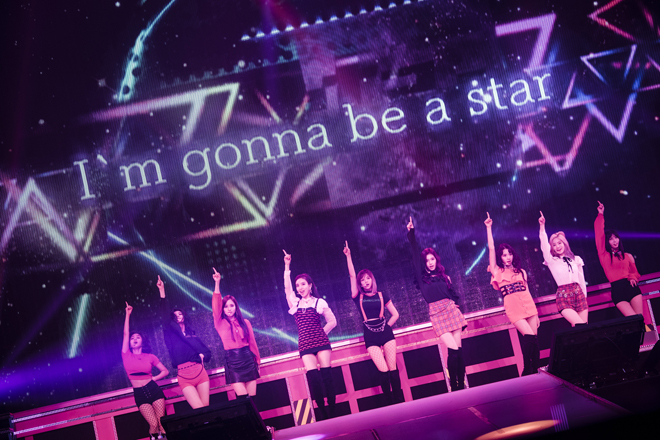 幕を開けたのは、「Wake Me Up」だ。ポジティブな気持ちを届けてきたTWICEの楽曲の中でも、歌詞を追っていくごとに未来に進んでいくための強い気持ちを得られるようなエネルギッシュなこのナンバーに、一気に会場のテンションが上がったのも無理はない。途中でモモのブレイクダンスにひと際大きな歓声が起こったことも印象的だ。次曲は、ファンの中でも人気の韓国のナンバー「l’m gonna be a star」。ソリッドな曲調と、ファイヤーボールの演出が映し出したのはワイルドな9人の姿だった。