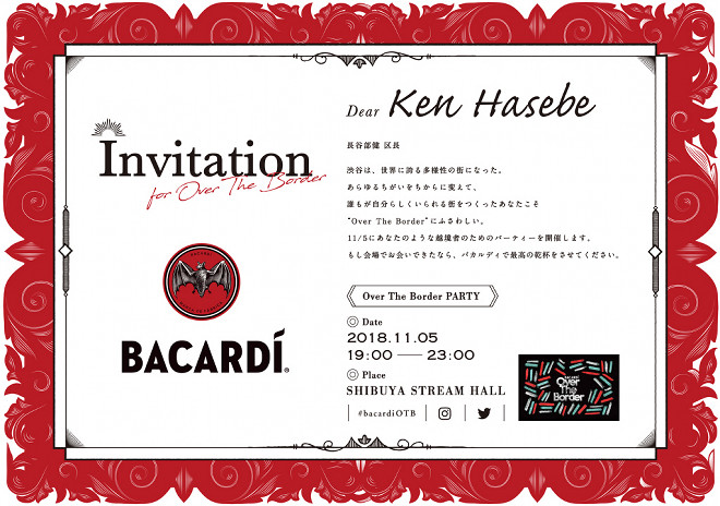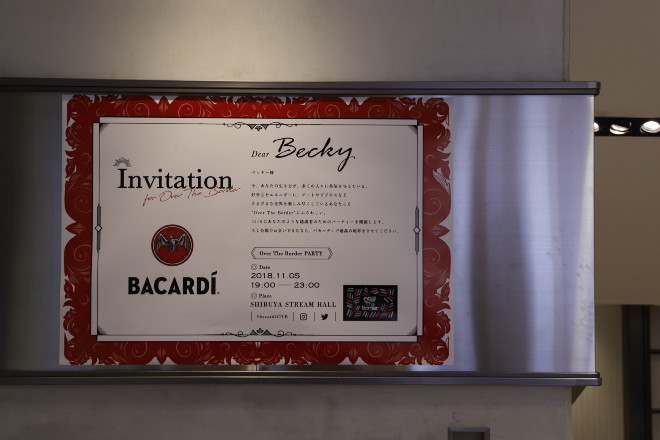 バカルディ主催の完全招待制フリーパーティ<BACARDI “Over The Border” 2018>の開催を前に、各界著名人への招待状を模したメッセージ広告が東京・渋谷エリアに出現した。