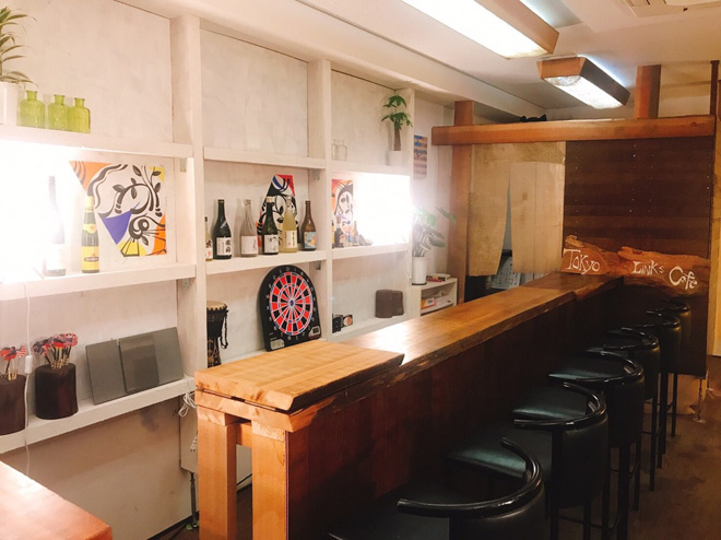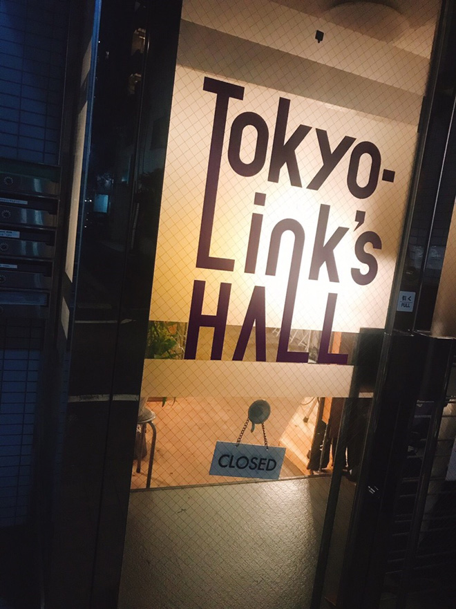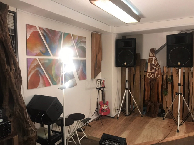 そこを抜けると縦長のどっしりとした全て木材のシンメトリーなカウンターが現れます。右側には段が作られ、背面には「Tokyo Links Hall」とデザインされたステージ。アコースティックLive用に楽器のピアノやカホン、配線系統のDIも完備しています。
