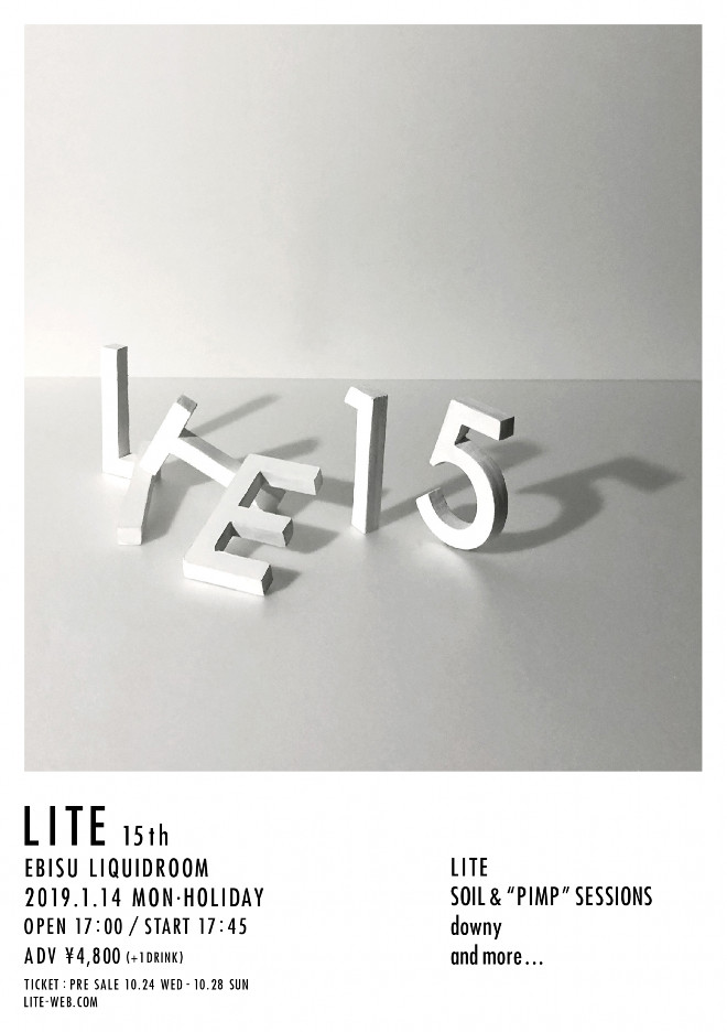 15周年イヤーの締めくくりを飾る<LITE 15th>は、自身と親交の深いアーティストたちを迎えて一夜限り開催される記念イベントだ。今回の発表では、SOIL&“PIMP”SESSIONSとdownyの2組の出演が明らかになった。LITEのオフィシャルサイトでは明日10月24日(水)より、チケットの先行受付が開始される。