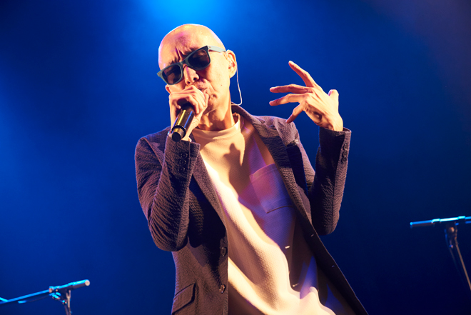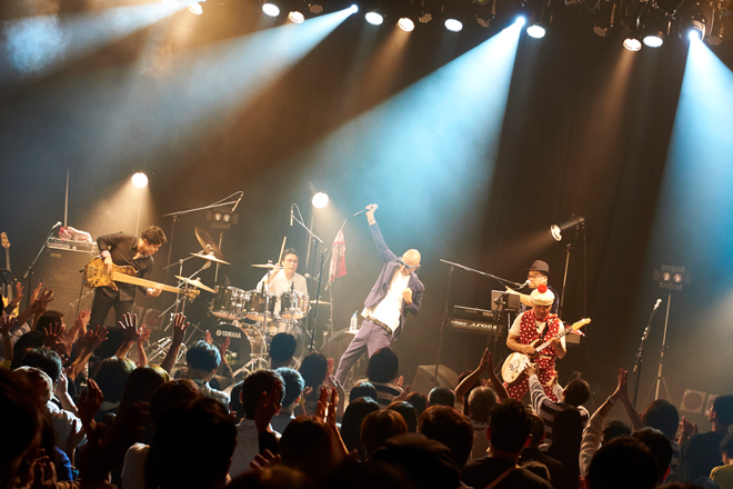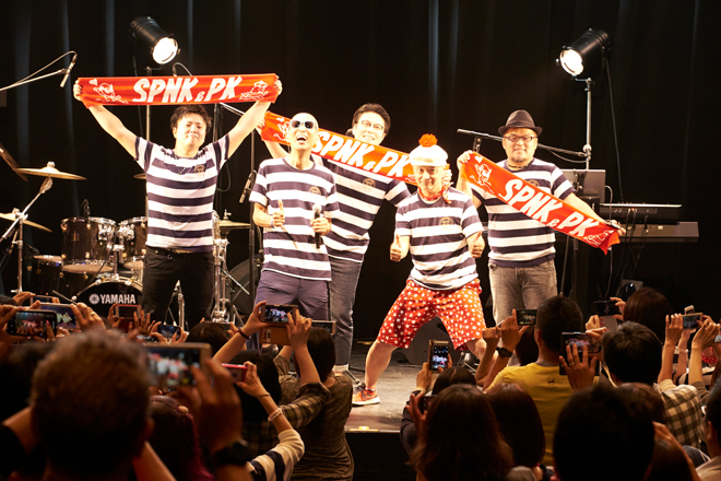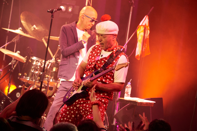 そんな客席へ切ないコードを弾きながら現れた水玉衣装のパッパラー河合は、ペロリペロリと「耳たぶ」を歌いながら笑いを誘い、そこへバンドメンバーが次々現れるとハードロック然としたセッションが始まり、そのステージ中央にスキンヘッドとサングラス、いつの時代もこの出で立ちでロックンロールしてきたサンプラザ中野くんがポジショニングすれば、会場中に「えらいこっちゃ! えらいこっちゃ!」とシャウトのシンガロング。その後も自称史上最悪のヘヴィメタルナンバー「たいやきやいた」など爆風スランプのキラーチューンを惜しみなく連発、20世紀に吹き荒れたロックとユーモアの爆風を甦らせていく。