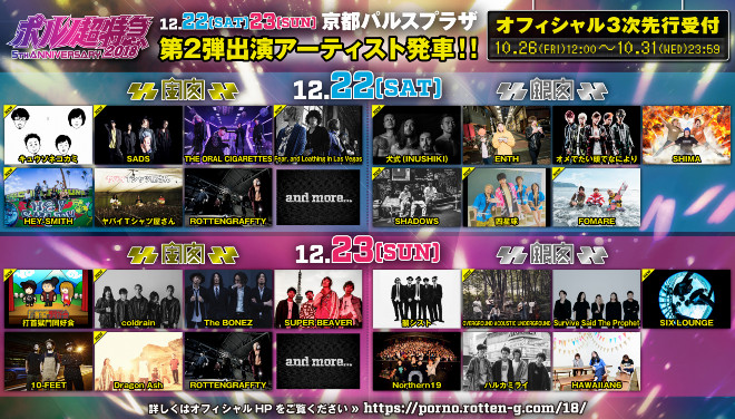 12月22日(土)、23日(日)に京都・京都パルスプラザで開催されるROTTENGRAFFTY主催の冬フェス<ポルノ超特急2018 -5TH ANNIVERSARY->の第2弾出演アーティストが発表された。