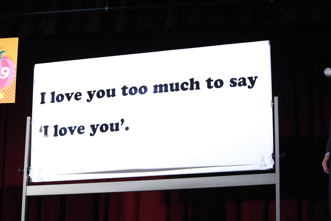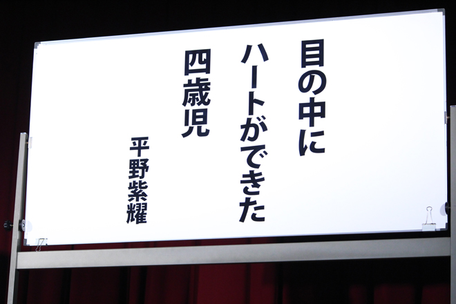 イベントは授業形式で展開し、1限目「英語」からスタート。2年間習った英会話で、覚えた単語は「Octopus」のみだったという平野は、「大好きすぎて好きって言えない」の英訳「I love you too much to say ‘I love you’.」を発音してみるよう促されると、「Listen you!」「Flat say」「Flat come on」など、「静かにして聴いてほしい」を平野なりの精一杯の英語で伝えたあとに、お題をぎこちなく発音。生徒たちはメロメロに。
