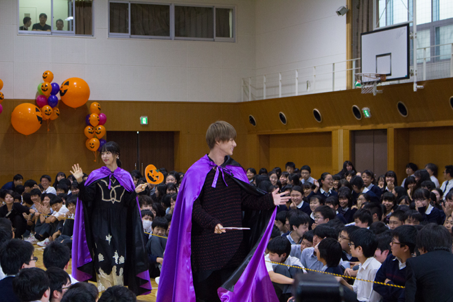 “特別授業”という名目で集められた同校の生徒たちは、仮装して現れた平野と桜井が仮面をはずすと悲鳴のような声を上げて歓喜。2人は生徒の間を通ってステージへと登壇した。