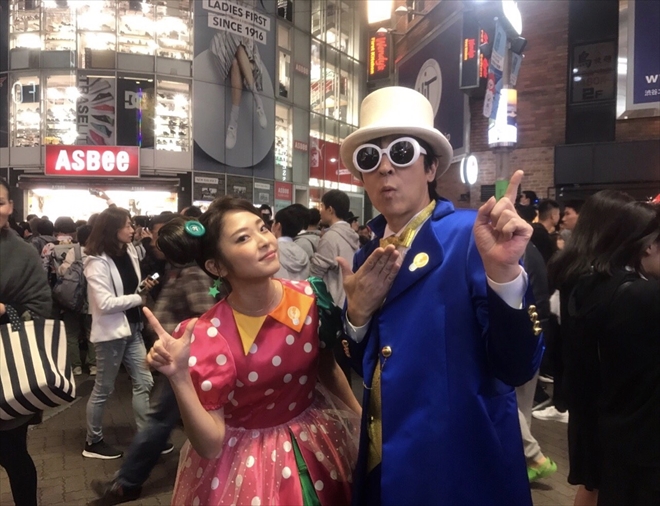 伊藤一朗扮する「はじめあきら」と宮脇詩音扮する「つくもちゃん」のユニット、「はじめあきらとつくもちゃん」が10月31日のハロウィンで大賑わいの渋谷へ衣装のままサプライズ登場した。
