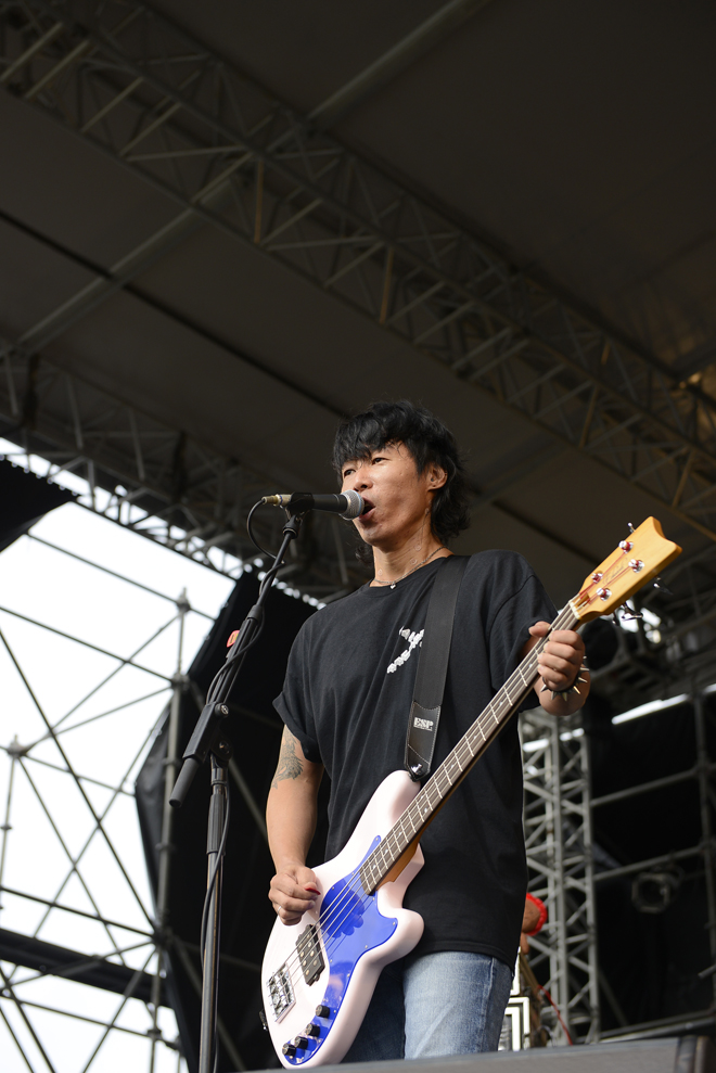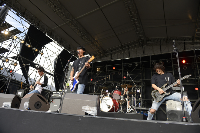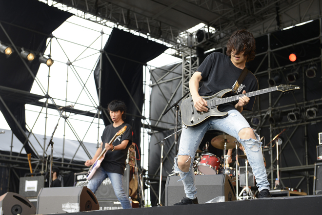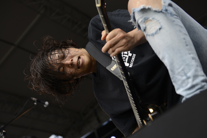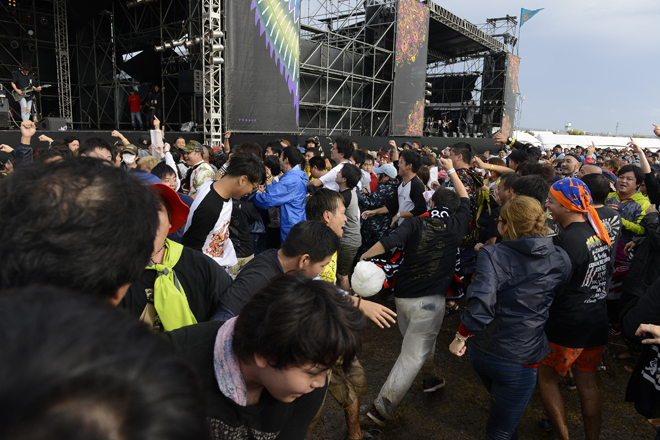 また、NAMBA69流メロディック・ハードコアとも言うべき「MANIAC」の爆発力も凄まじく、サークル・モッシュが勃発する青空ライブハウス状態と化す騒ぎっぷり。NAMBAを筆頭に、ko-hey(G,Cho)、K5(G)、SAMBU(Dr)と現4人体制になり、バンドはライブを観るたびに強靭な一枚岩へと成長を遂げている。繰り出される楽曲群に観客も全力で応え、熱い磁場を作り上げていた。