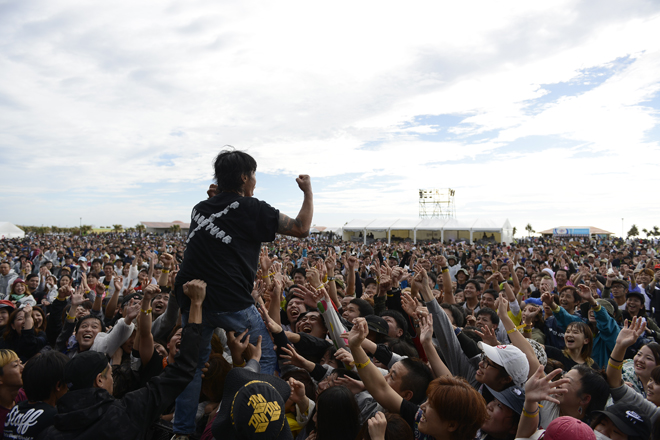 「Hi-STANDARD活動休止後、8年間沖縄にいた。そこで清作(MONGOL800)にまた音楽をやろうと言われて、救われたんだよね。あと、三線で踊ってるお婆ちゃんの姿を見て、感動したんだ」とNAMBA(Vo,B)はライブ中盤に切々と語っていた。こんなMCもここ沖縄でなければ、まず聞くことができないだろう。そんな沖縄に対する感謝の気持ちを胸に秘め、NAMBA69は豪快なパンク・ロックを搔き鳴らした。